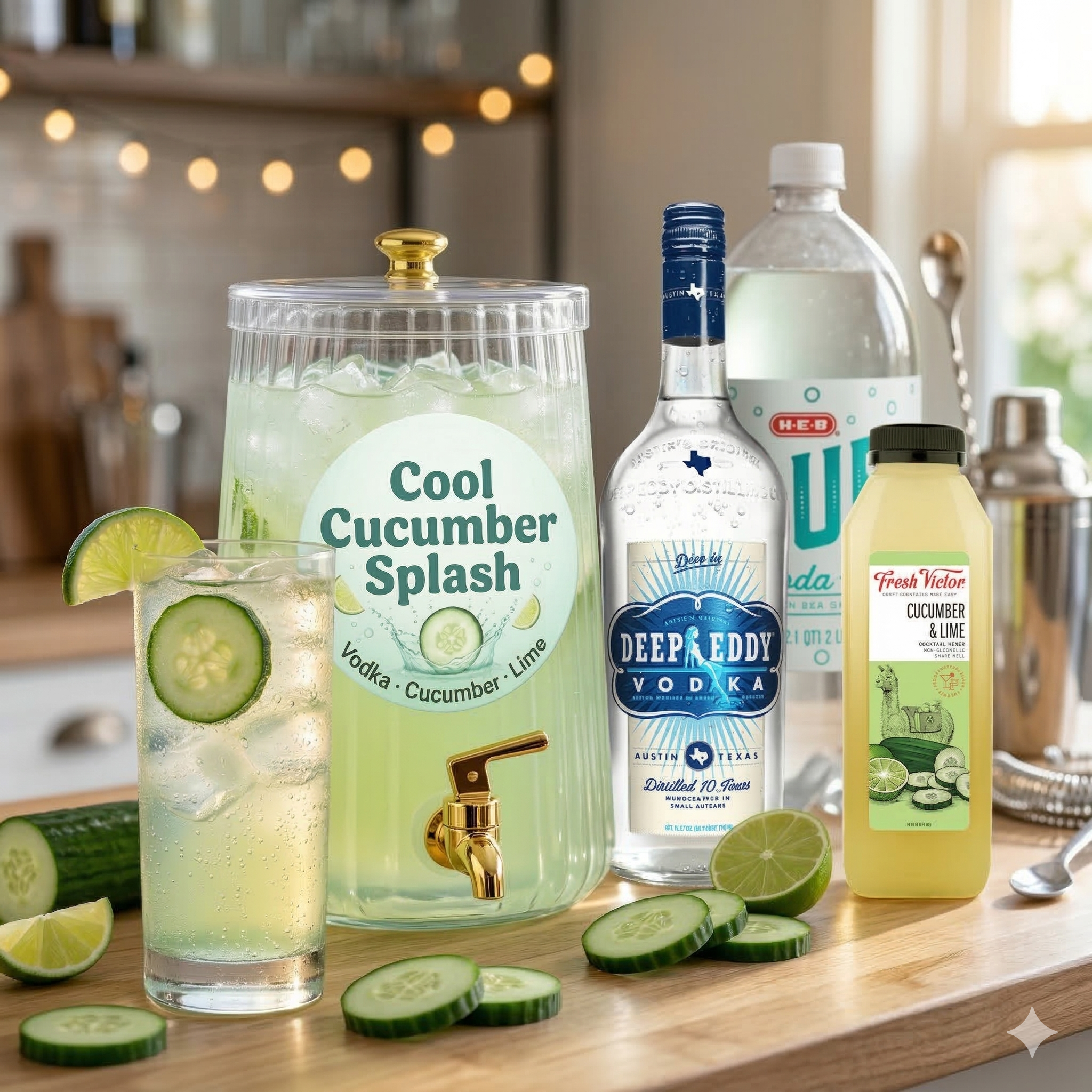 A clean, light vodka soda with cucumber-lime flavor. Deep Eddy Vodka, Fresh Victor Cucumber & Lime, and club soda. Low-cal crowd-pleaser. Serves 16 drinks. Drink dispenser included.