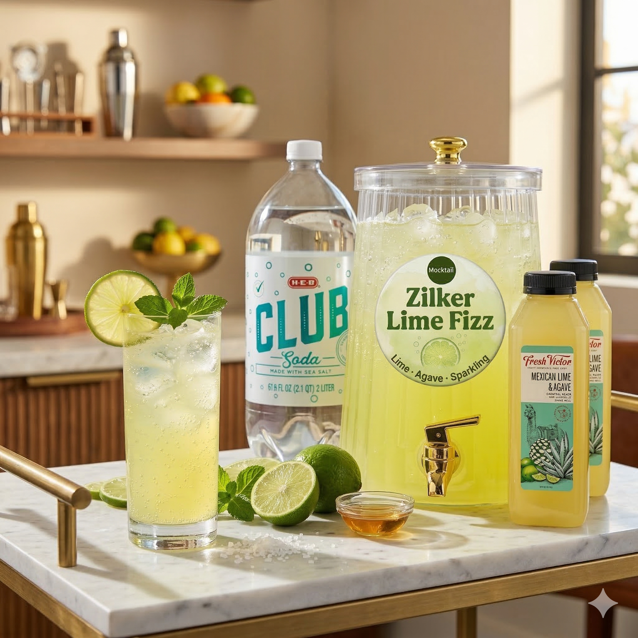 All the lime-agave flavor, none of the booze. Fresh Victor Mexican Lime & Agave with club soda. A virgin margarita vibe for the non-drinkers in the group. Serves 16 drinks. Drink dispenser included.